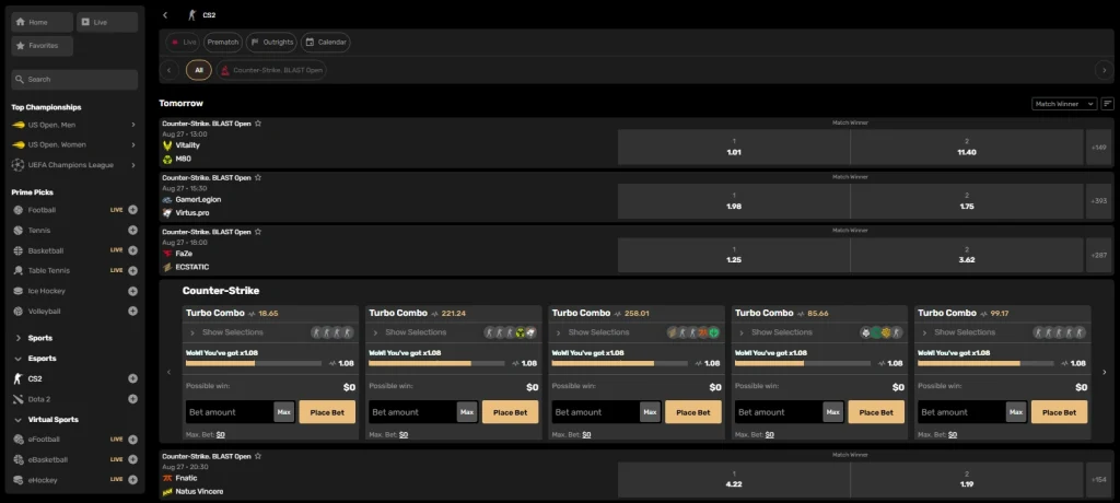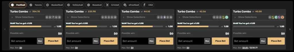 Com mais de 100.000 eventos disponíveis para apostar, as tuas opções são praticamente ilimitadas. Cobrimos tudo, desde campeonatos internacionais a competições locais, garantindo que nunca ficas sem oportunidades para fazer uma aposta. Esta seleção massiva é uma característica central da plataforma Fairspin sports.
